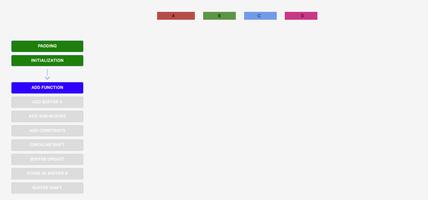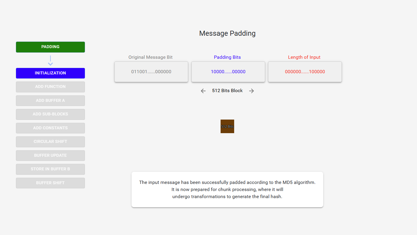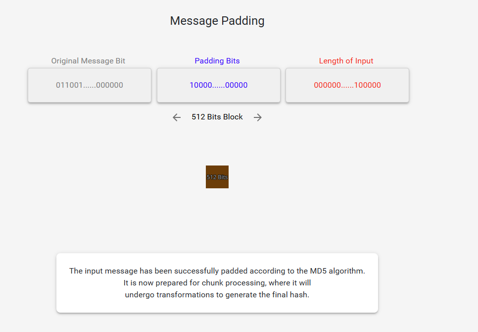 Step 2. The message padding bits are displayed on the screen. Hover over the box to understand how the padding bits are added.